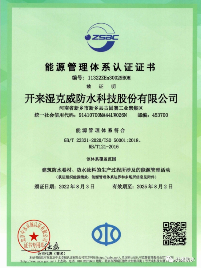 公司通過近一年的積極籌備,在低碳節(jié)能方面,通過多種途徑,降低能耗,發(fā)展綠色產(chǎn)品之路,實現(xiàn)供銷存財?shù)膮f(xié)同發(fā)展。經(jīng)過北京中水卓越認證有限公司的審核,于2022年8月3日獲得《能源管理體系認證證書》。該證書的獲得,是繼知識產(chǎn)權(quán)管理體系、兩化融合管理體系認證之后,又一個標志性的認證,標志著開來濕克威防水科技股份有限公司向綠色低碳發(fā)展的方向上又進了一步。